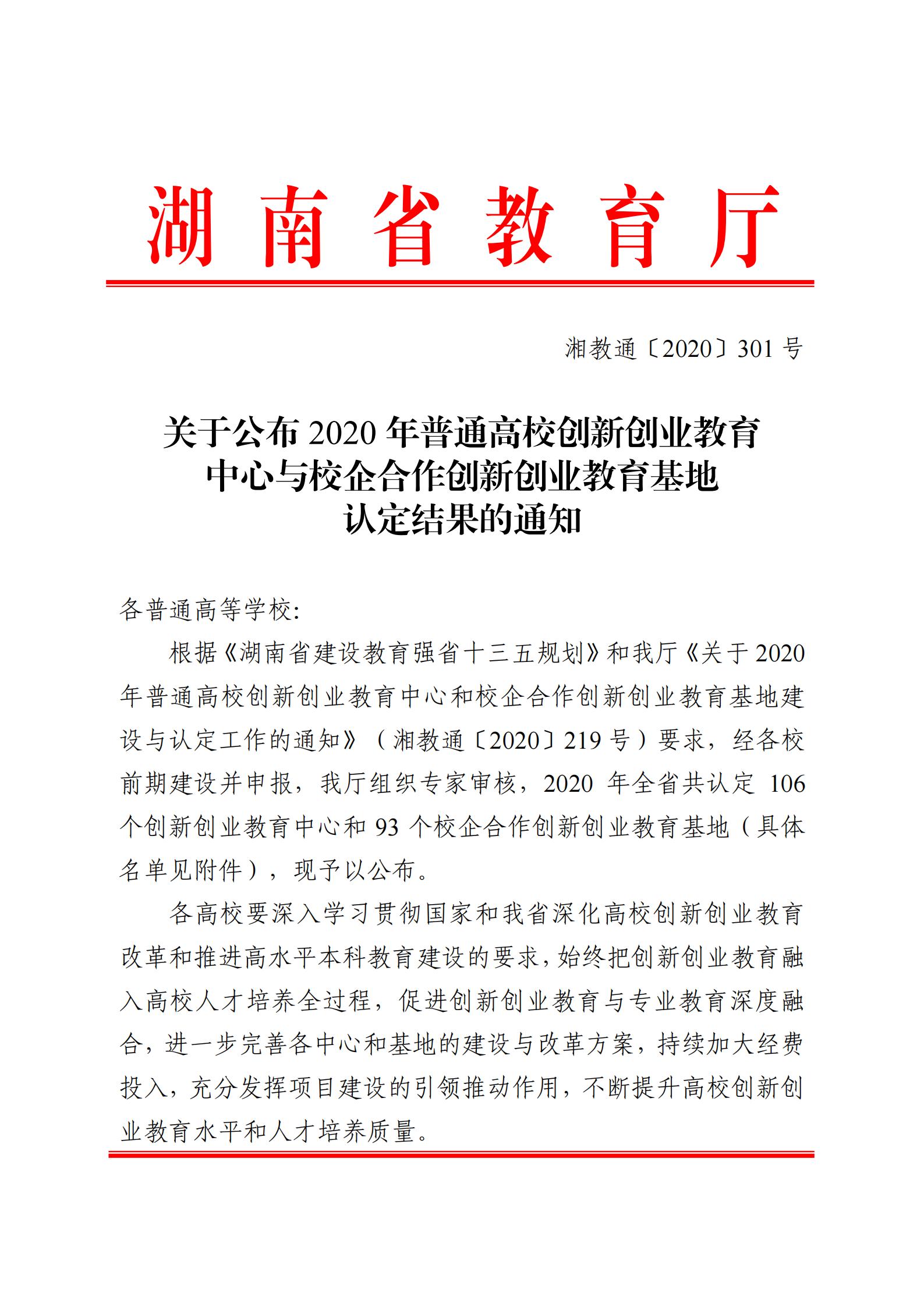 聂志军老师负责的“文科师范类专业创新创业教育基地”认定为湖南省2020年普通高校校企合作创新创业教育基地