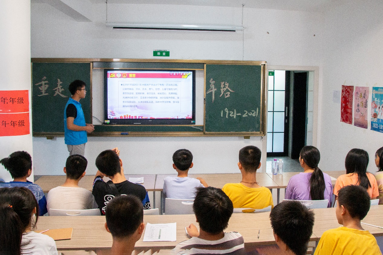 “1927年,中国共产党在井冈山建立了第一个革命根据地……”志愿者张家华讲述了红船精神、万里长征、新中国成立等党的革命历程,带领学生观看了《觉醒年代》、《那年那兔那些事》等视频片段。志愿者王彤为同学们介绍了中国社会主义建设时期作出伟大贡献的先进党员。她由衷地说道:“看着同学们从最开始的羞涩到勇敢地走上台用所学的党史知识诉说自己的认识,我觉得这堂课就是有意义的!”