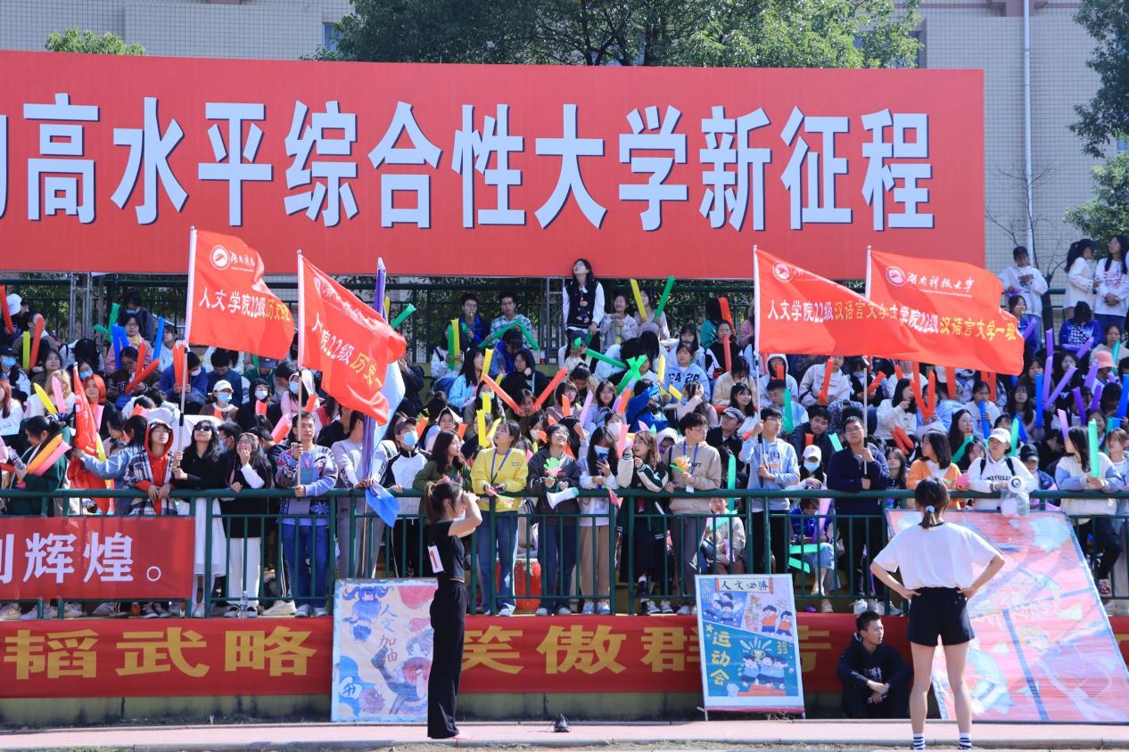 听,他们在热情高喊“加油”,吹起阵阵哨声;看,场外彩旗飘飘,迎风飞舞。观众席的观众们正满腔热血为运动员们摇旗击鼓,激动之时,也不禁站起身来,奋力呐喊。“虽然太阳晒得我们有点睁不开眼睛,但想到运动场上的同学们都不畏辛苦,奋勇向前,我们作为观众有什么好抱怨的呢。”22级文学二班申美凤这样说道,“我们大力挥舞着应援棒,喊着‘人文加油’,只为做好运动员们的最强后盾,让他们知道,身后还有我们这群人在支持他们。”