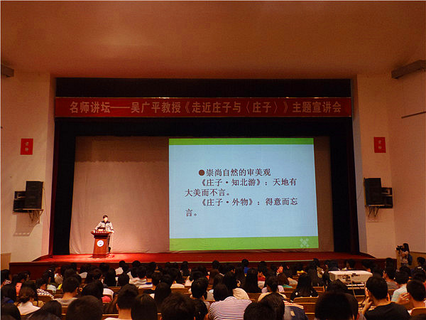 讲座中,吴教授深入浅出、生动形象地阐述了庄子复古倒退的历史观、相对主义的认识论、消极厌世的人生观、崇尚自然的审美观和《庄子》奇特的寓言故事、奇特的人物形象、奇诡的文章章法。幽默诙谐、纵横捭阖、浑洒自如的演讲,不时赢得阵阵掌声。