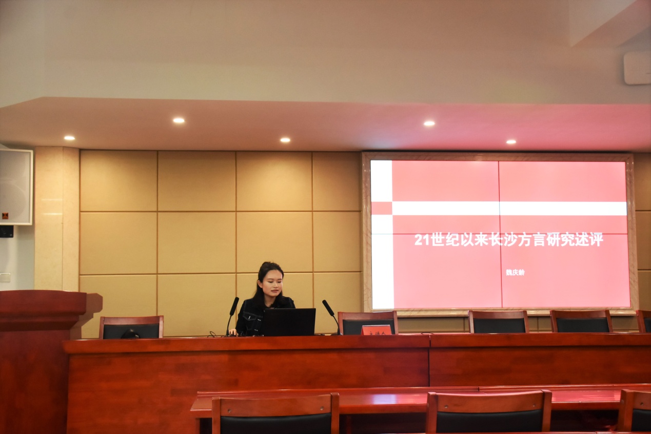 报告会全程采用ppt展示的方式,由我院成功入选校优秀论文一等奖的六位报告人作论文简述。魏庆龄从语音的历史演变特点,长沙方言语法、词法、句法等方面进行论文讲解,提出其论文是以21世纪以来长沙方言研究为重点。张永娜简述了她分步骤完成论文的写作过程,从“狭义修辞学”、“广义修辞学”对汉语修辞进行了界定。而黄楚倩则从《纪实与虚构》这篇小说中窥探出王安忆小说的“不要特殊环境特殊人物,不要太多材料,不要语言风格化,不要独特性”这“四不要”规则。