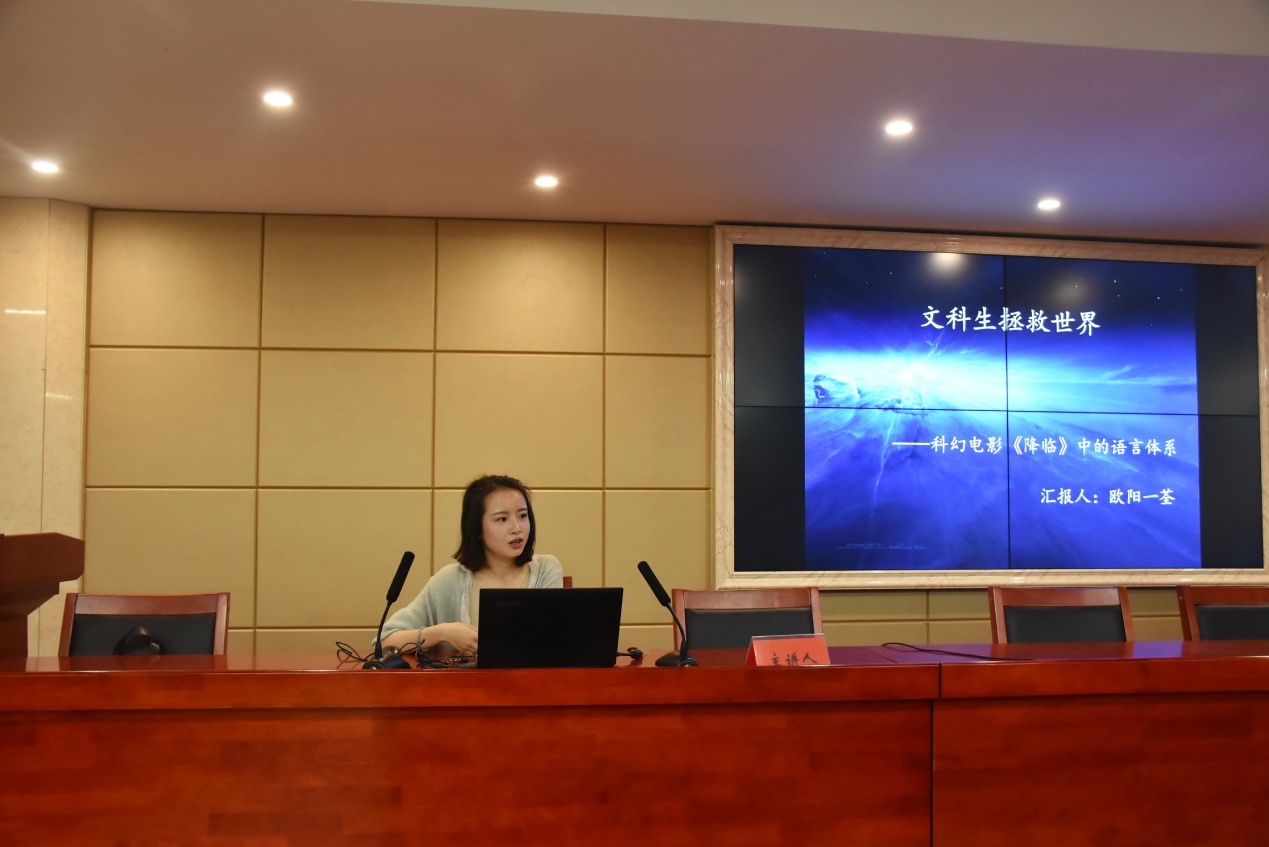 “学语言的女主人公通过破译外星文,成功拯救世界,一改传统电影模式,这说明我们文科生也能拯救世界!”欧阳一荃笑着说道,她通过分析科幻电影《降临》中的语言与思维,从文科生拯救世界的角度建构其论文的语言体系。在广泛查阅参考傅惜华藏及戏剧原本后,王之在《乾隆朝江南文人迎銮名俗文化探析》这篇论文中提出了乾隆南巡、迎銮戏、名俗文化这三大创新点。而王意则以“湖湘复兴之导师”邓显鹤为研究对象,从小角度切入,结合湖湘文化这一热点研究,分析其所处的历史背景以及对后世革命运动的影响。