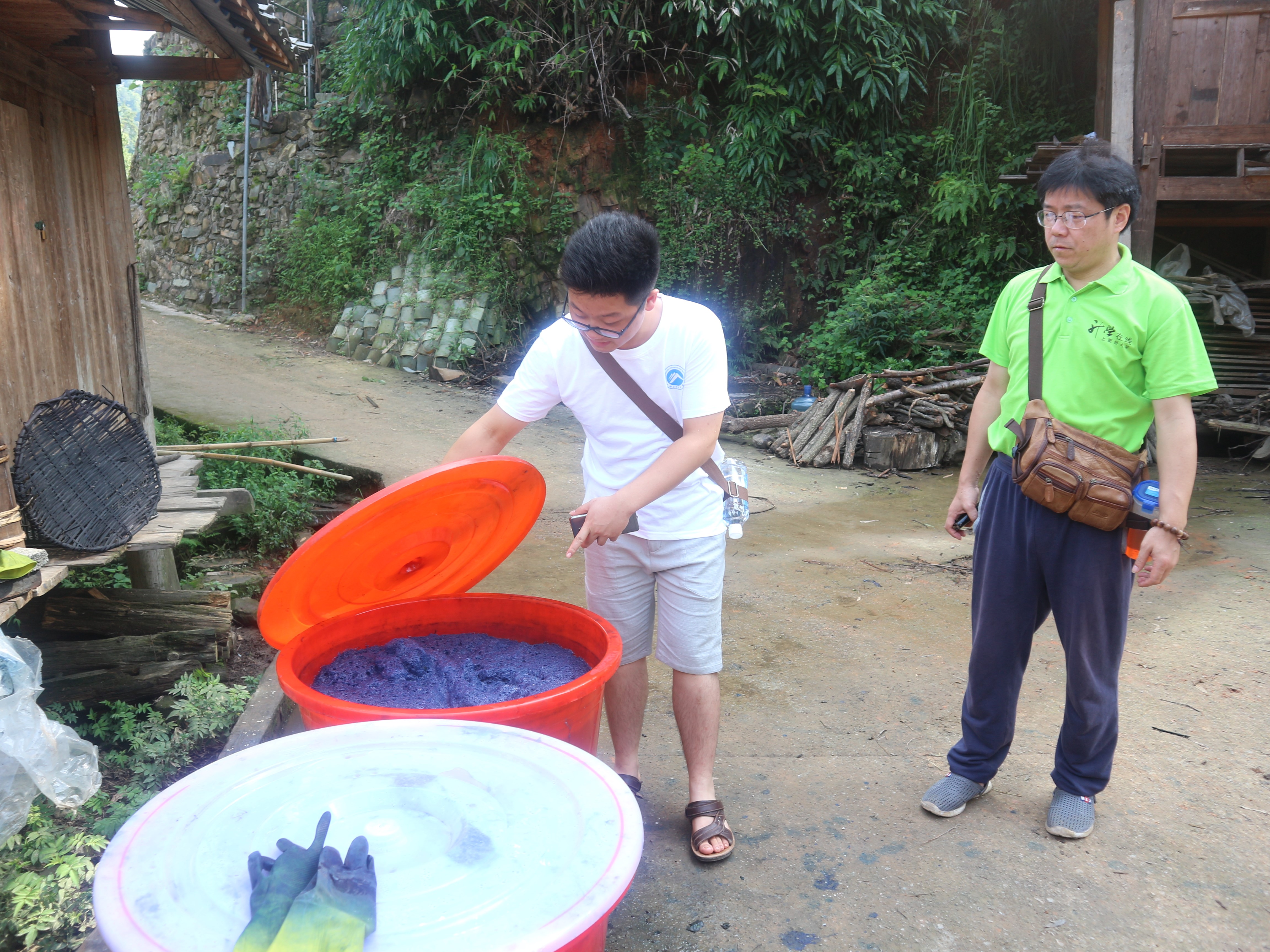 7月14日是个大晴天,为了更好地了解占里的旅游资源状况,团队成员们在当地向导的带领下顶着烈日,先后参观了占里的鼓楼、斗牛饲养棚、从江稻-鱼-鸭复合系统生态种养示范基地,并到农户家体验、学习了靛蓝染布工序、禾晾晒谷、糯稻脱粒等农事生产活动。在基本了解村寨情况的基础上,下午团队成员分组进入农户家中开展访谈调研,对于当地传统文化保存状况、传统文化传承措施及旅游开发政策等具体信息进行收集记录。同时采访了村寨的村干部和寨老等代表性人物,掌握了较为具体的信息材料,这对我们科技服务团队在接下来的旅游开发与传统文化保护项目的实地考察中进一步发现问题、提出意见建议和解决问题有了良好的开端。