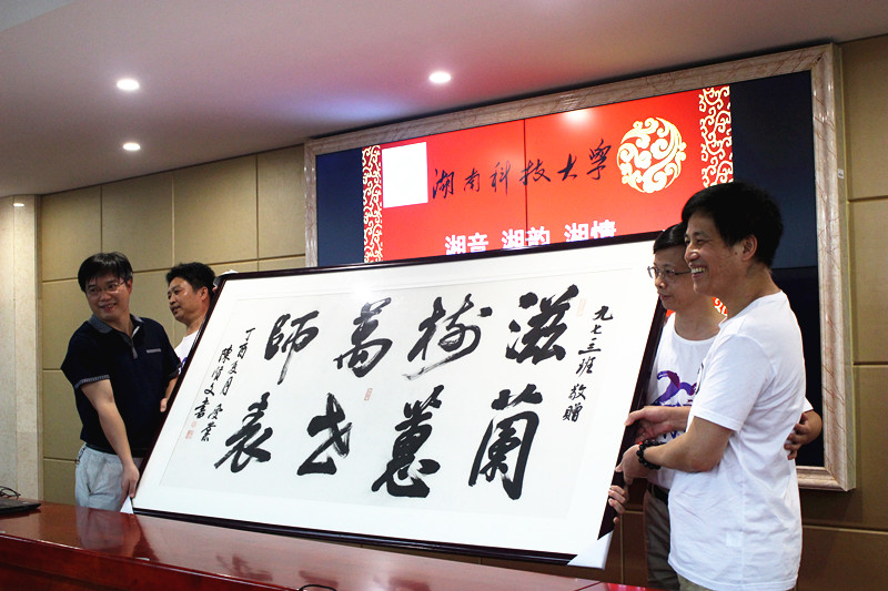 “二十年前翩翩来,春华作伴次第开。”谢奇勇教授作诗一首表达此次聚会。同学们也为母校送上一幅书法作品“万世师表”,表达敬意。座谈会结束后,师生们参加洗尘宴。