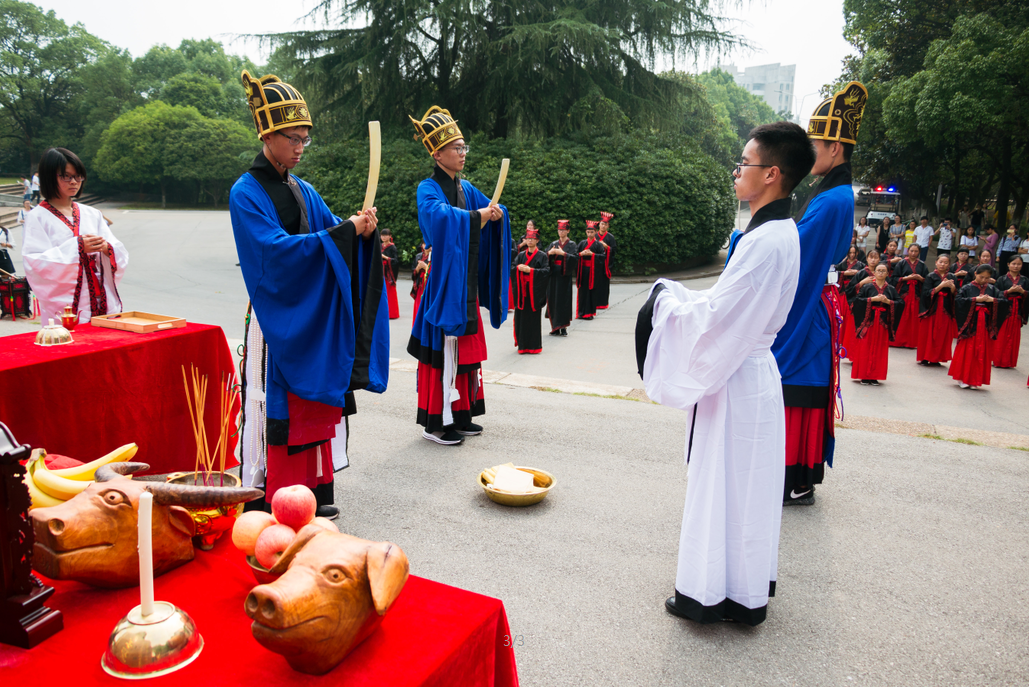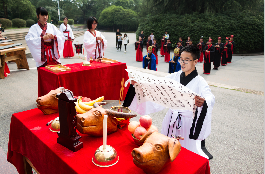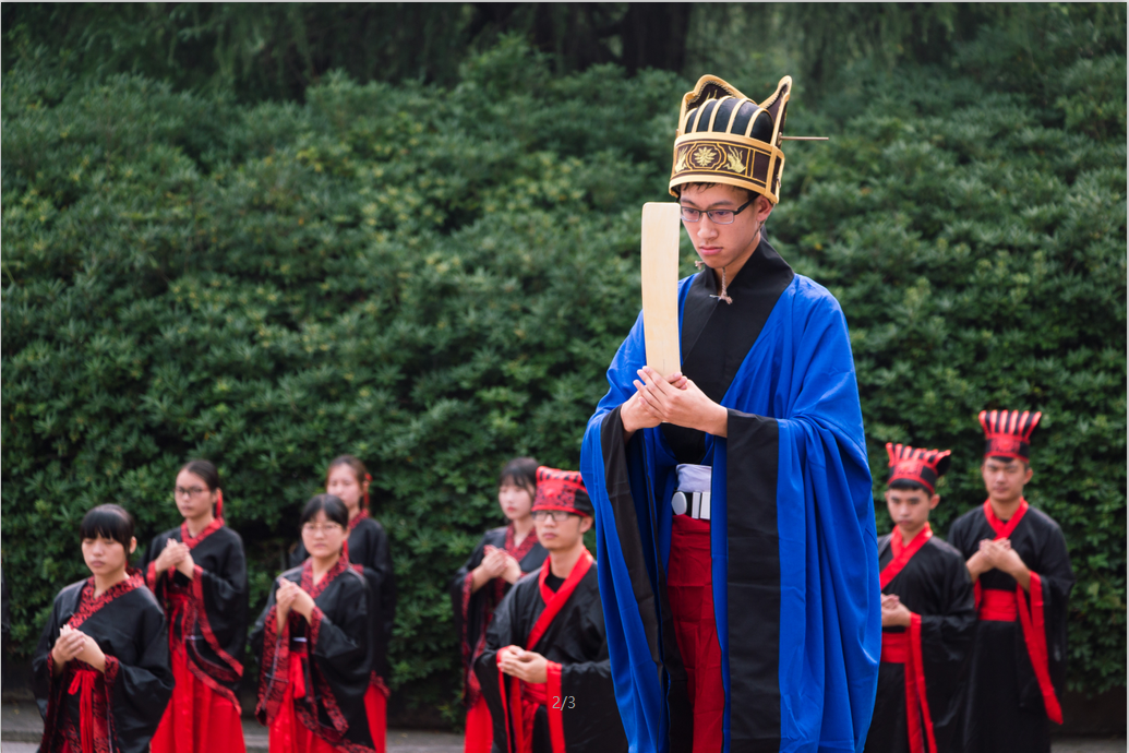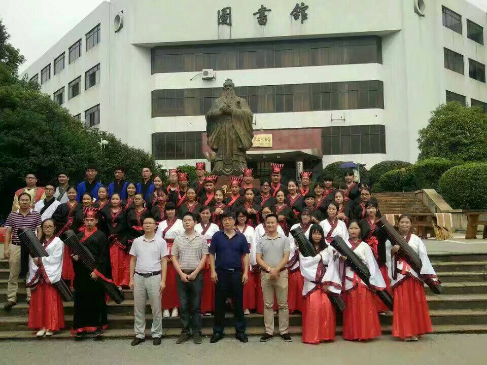 鼓声镗镗,琴声淙淙,舞袖翩翩,诵声朗朗。为弘扬传统文化,传承儒家思想精神,9月23上午,迎着微凉的晨风,由隐山哲学社主办,幽篁古琴社、古莲汉韵社协助办理的祭孔大典在北校图书馆前庄严开场。我院院长刘奇玉,历史系张晚林教授,思政系李育军教授,颜中军教授,朱学恩教授等领导老师到场,祭孔现场吸引了校内外观众前来观看。