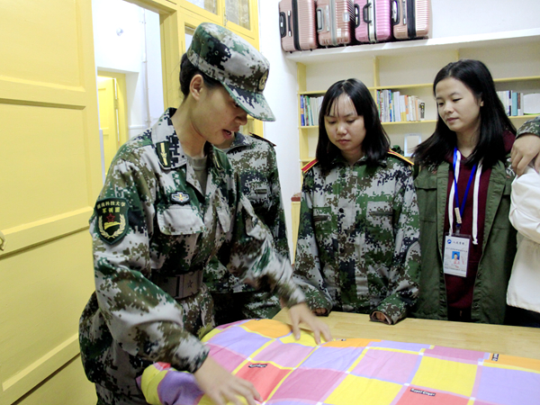“教官中秋节快乐!”10月4日晚正是中秋夜,教官下寝中,处处能听到这样的声音。各排教官由助班带领进入新生宿舍,下寝的主要任务是教会新生怎么叠“豆腐块”被子。七排教官黎吟香一走进五区新生寝室,就受到大家的热烈欢迎。黎教官一边向大家示范怎么叠“豆腐块”,一边和大家聊着天,寝室充满了温馨随意的氛围。 另一边,五区二栋505新闻系寝室和508思政系寝室中人头攒动,两位教官叫来各寝室长观看如何叠被子,吸引了大量新生前来观看。新生在聊天中得知教官也是来自学校各学院的学长学姐,更是拉近了双方间的距离。