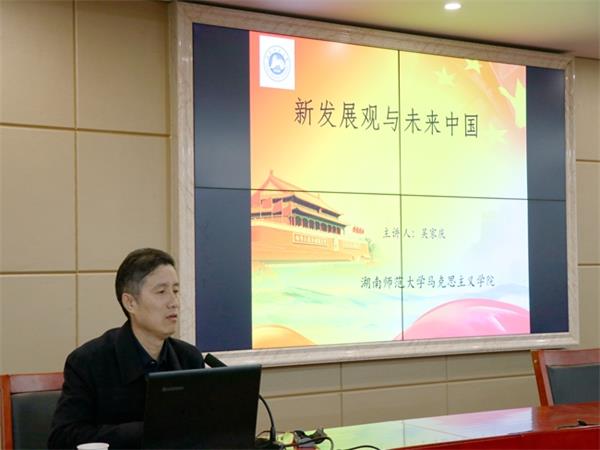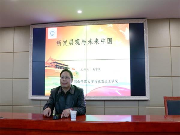 11月13日晚,立言楼B4-1会议室座无虚席。湖南师范大学马克思主义学院院长吴家庆教授应AK网页版页面登录_AK(中国)诚邀开展“人文大家讲坛”第149讲暨题为“新发展观与未来中国”的主题讲座。AK网页版页面登录_AK(中国)党委书记廖加林教授出席并主持讲座,副院长毛小平博士、张晚林教授、罗建文教授、颜中军博士、凌应生博士、龚超博士等老师及我院100余名思想政治教育、哲学专业同学到场聆听讲座。