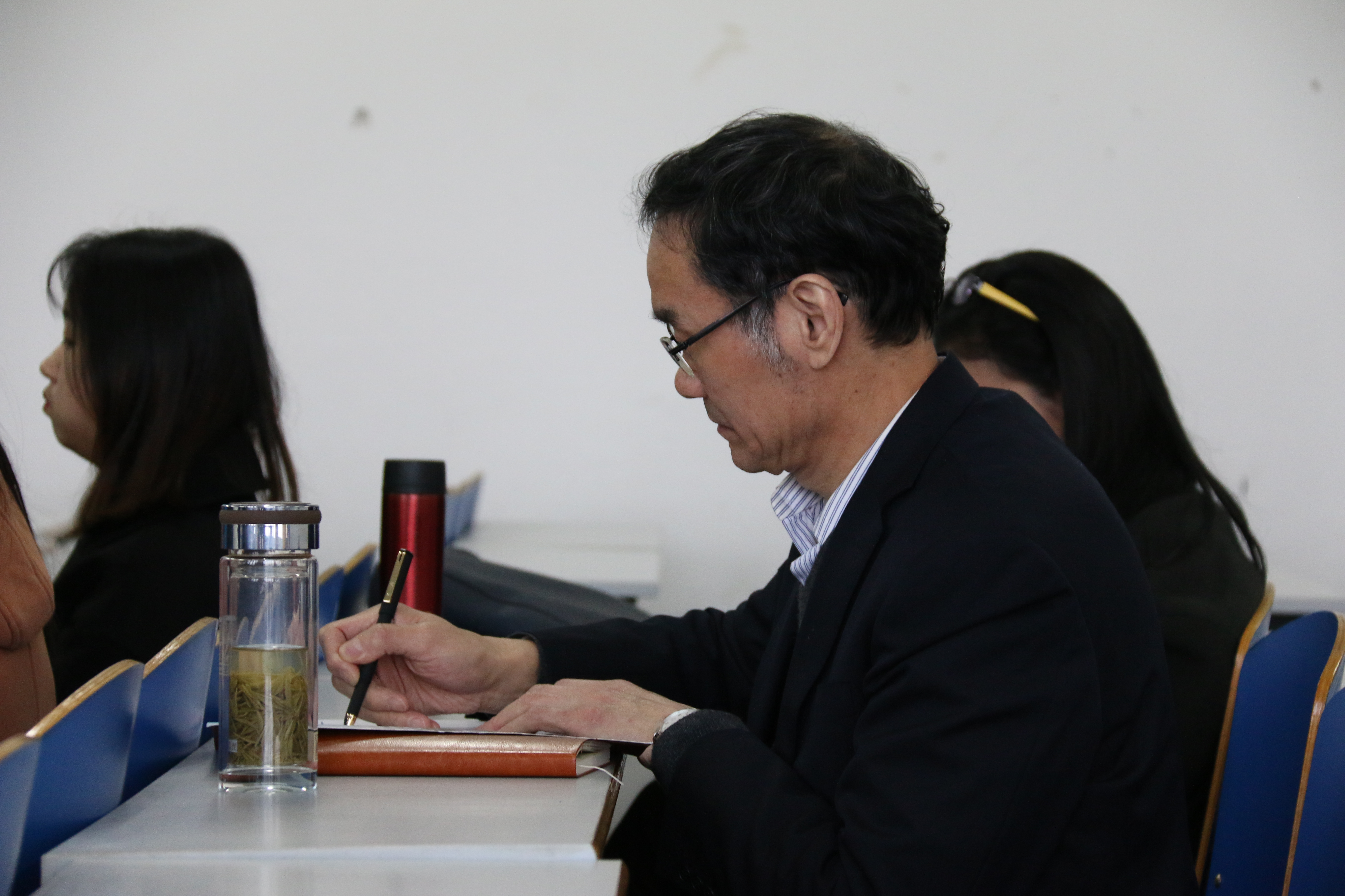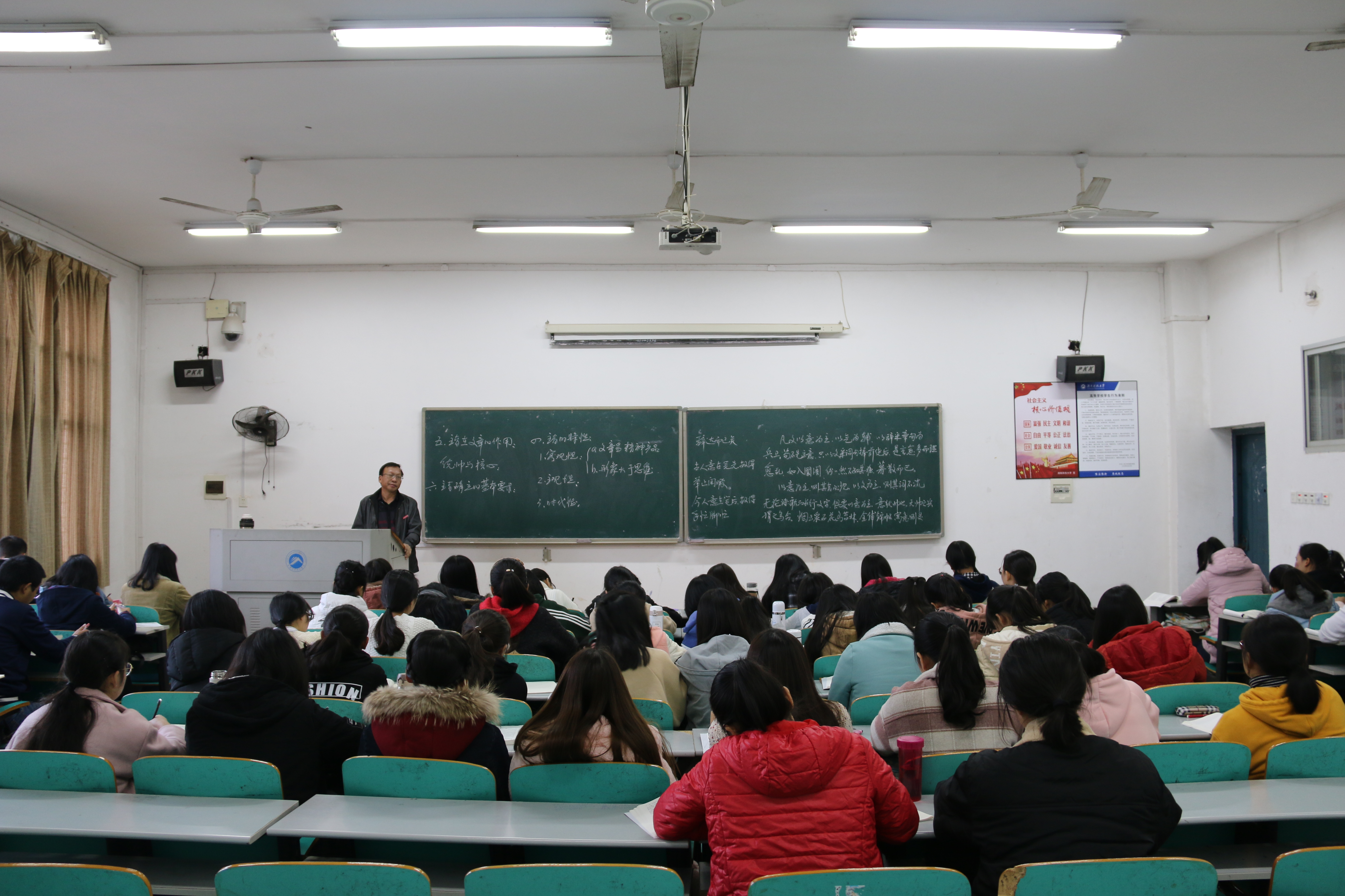 距上课还有15分钟,17级汉语言文学五班的同学们就已到达教室,主动将手机放入收纳袋中,然后回到座位上拿出课本,授课老师也早已到达教室,为上课做着准备。上课铃声准时响起,老师一边生动有趣地讲解,一边在黑板上工整地板书。同学们被精彩的内容深深吸引,瞪大了眼睛望向黑板,时而手撑下巴蹙眉思考,时而低头握笔快速记录。课堂上师生们积极互动,每当老师抛出问题时,同学们都耐心思考,然后踊跃发表自己独到的见解;遇到重难点时,同学们也会马上向老师提出疑问。随机听课的专家们坐在教室最后一排,或观察学生的听课状况,点头应和老师所讲授的内容,或埋头整理考察记录。两节课下来,同学们纷纷表示,老师讲的知识点让人受益匪浅,远离“低头一族”让他们感受到课堂的魅力。