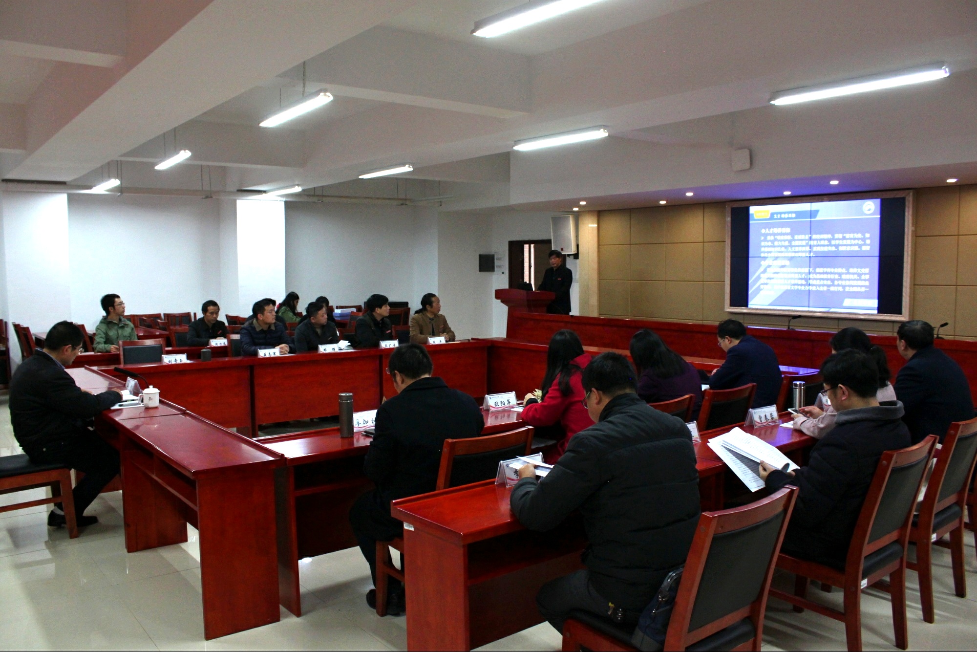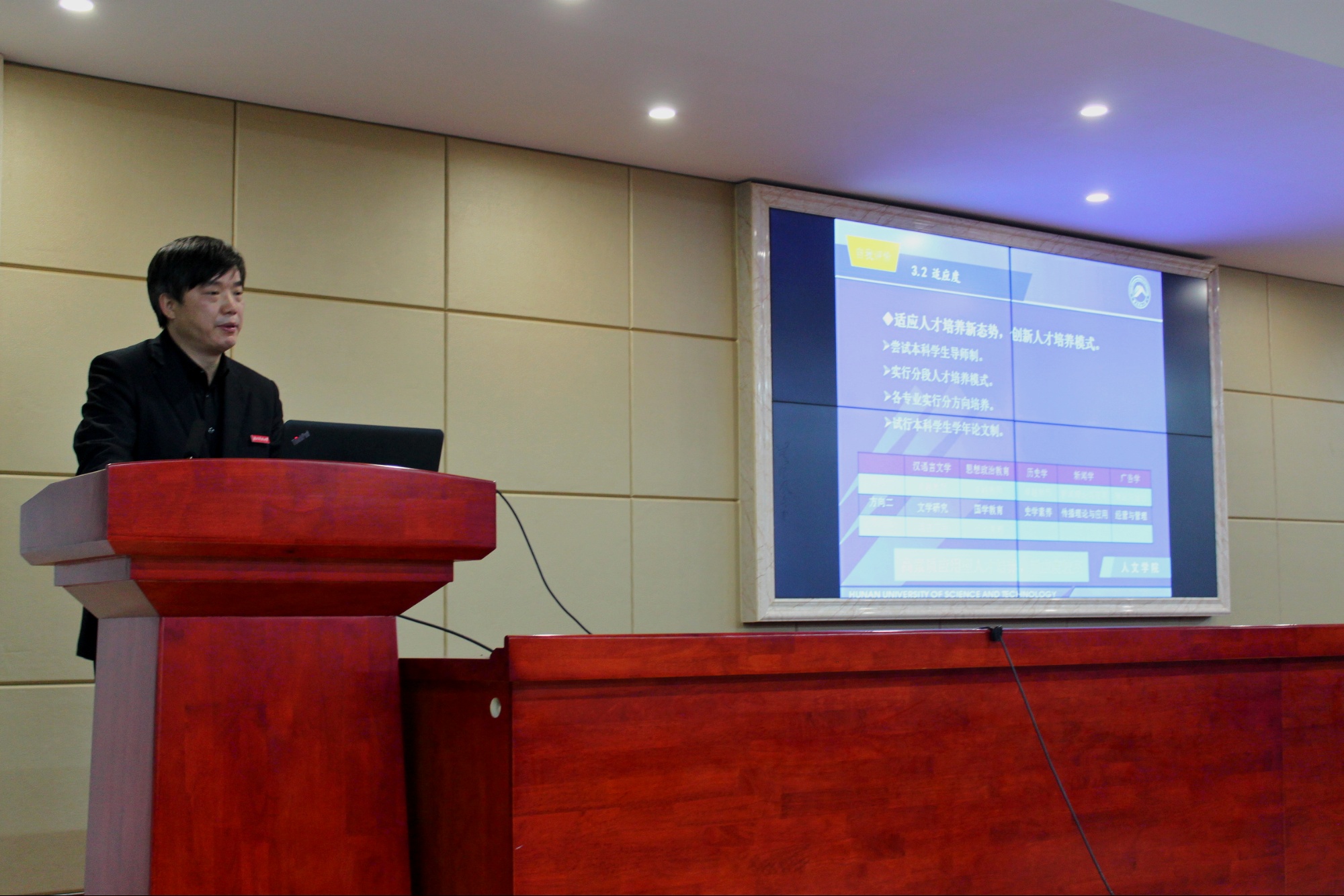 上午9时许,现场考察转移到立言楼B4-1报告厅,院长刘奇玉教授主持会议并做简要的汇报,院领导、相关系部负责人和教师代表近20人出席会议。刘院长首先简要阐述了AK网页版页面登录_AK(中国)的办学历程以及办学现状,学院的师资队伍以及定位与目标,他指出我院的办学类型是教学研究型,办学层次是本科教育为主,发展目标是特色鲜明的高水平教学研究型学院。3211工程、豆沙包工作室、黑蚂蚁传媒工作室、语言艺术团、隐山哲学社等学院优秀项目是学院坚持“守正创新”办学宗旨的重要体现。