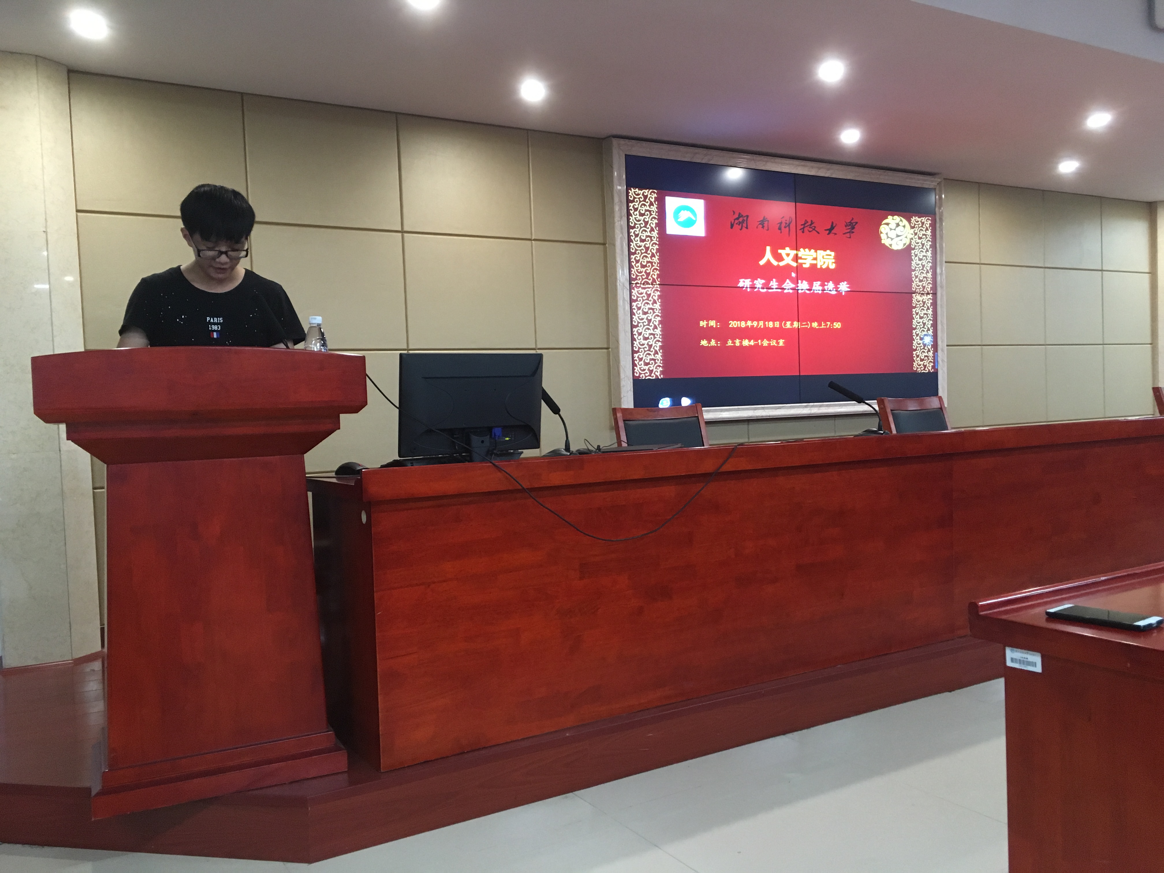 会议主要包括换届致词、颁发聘书、竞选演讲和无记名投票四个环节。会议开始,院研究生会主席邬林明作了关于过去一年的工作汇报。主要包括学院取得的各项优异成绩,以及大家关心的学生评选工作。同时,他还分享了这一年的任职经历,并指出:要懂得善始善终,做一个有责任和担当的研究生会干部。