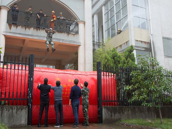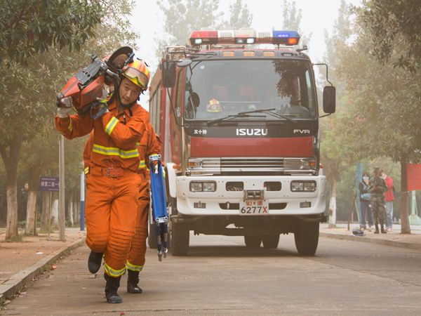 “呜——”伴随着消防车警笛响起,学生们面前的教学楼升起了滚滚浓烟。消防官兵们反应迅速,用水枪控制住了火势,冲入模拟火场进行救援。“双手抱头!不要怕!气垫就在下面!”消防员一边将救生气垫安置好,一边对二楼平台的“被困人员”进行着指导。只见她双手抱头,纵身一跃,稳稳地落在了救生气垫上,标准的动作也引得了学生们的一阵掌声。