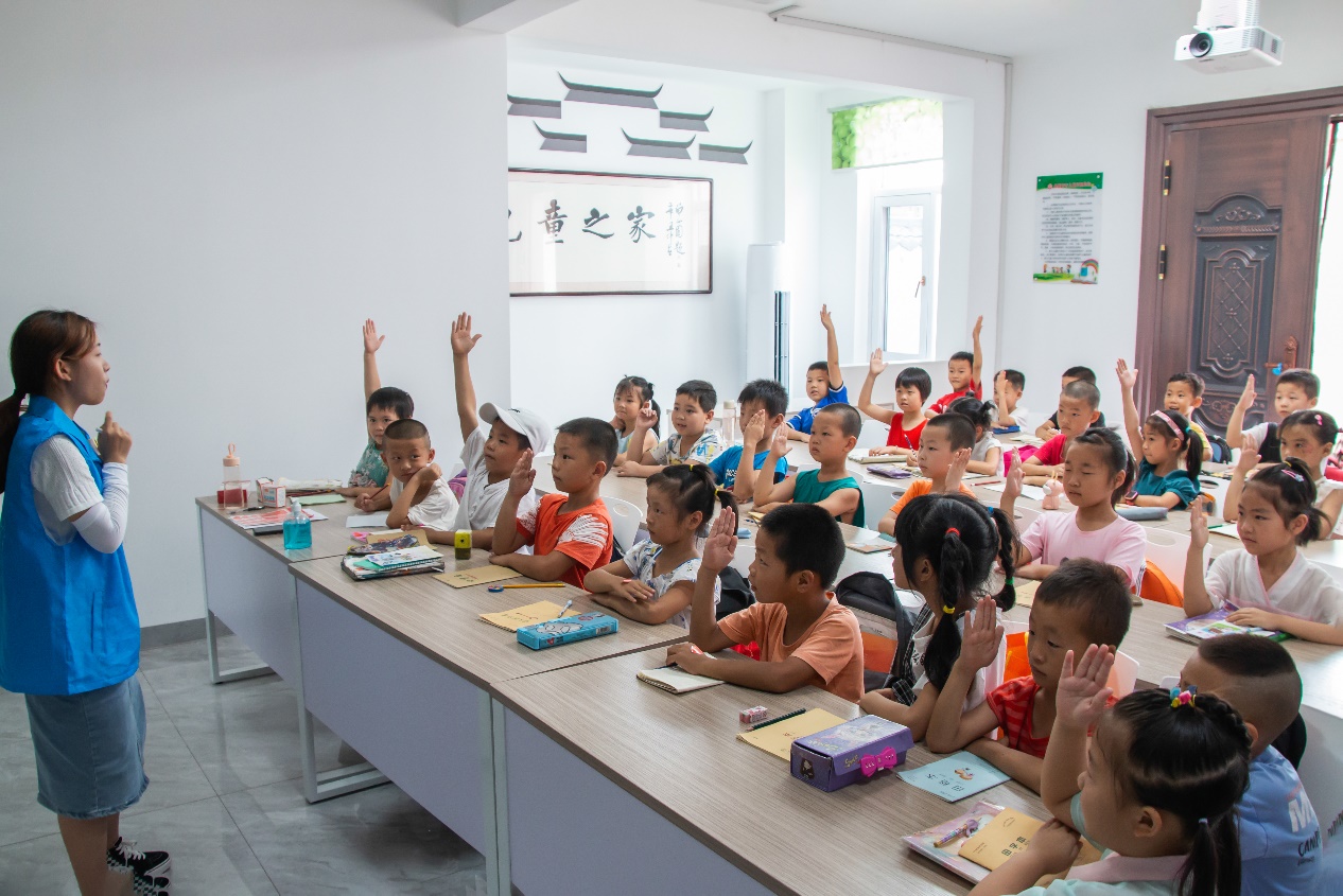 一年级数学课堂上,志愿者郑添卉笑着问道:“大家觉得数学好玩吗?”“好玩!”台下的同学们异口同声道。“没关系,满怀教学热情的老师会带大家慢慢走进数学奇妙世界,让大家发现其中有趣的东西。”二年级的语文课上,志愿者吕飞叶让同学们在黑板写名字,以此认识每个学生,并且纠正他们的笔顺错误,规范其书写顺序。三年级的美术课,琳琅满目的书法书法美术作品吸引住台下一寸寸的目光,志愿者龙子尧为同学们介绍国画、水墨画、壁画、刺绣、雕塑等,引起他们的热烈讨论。