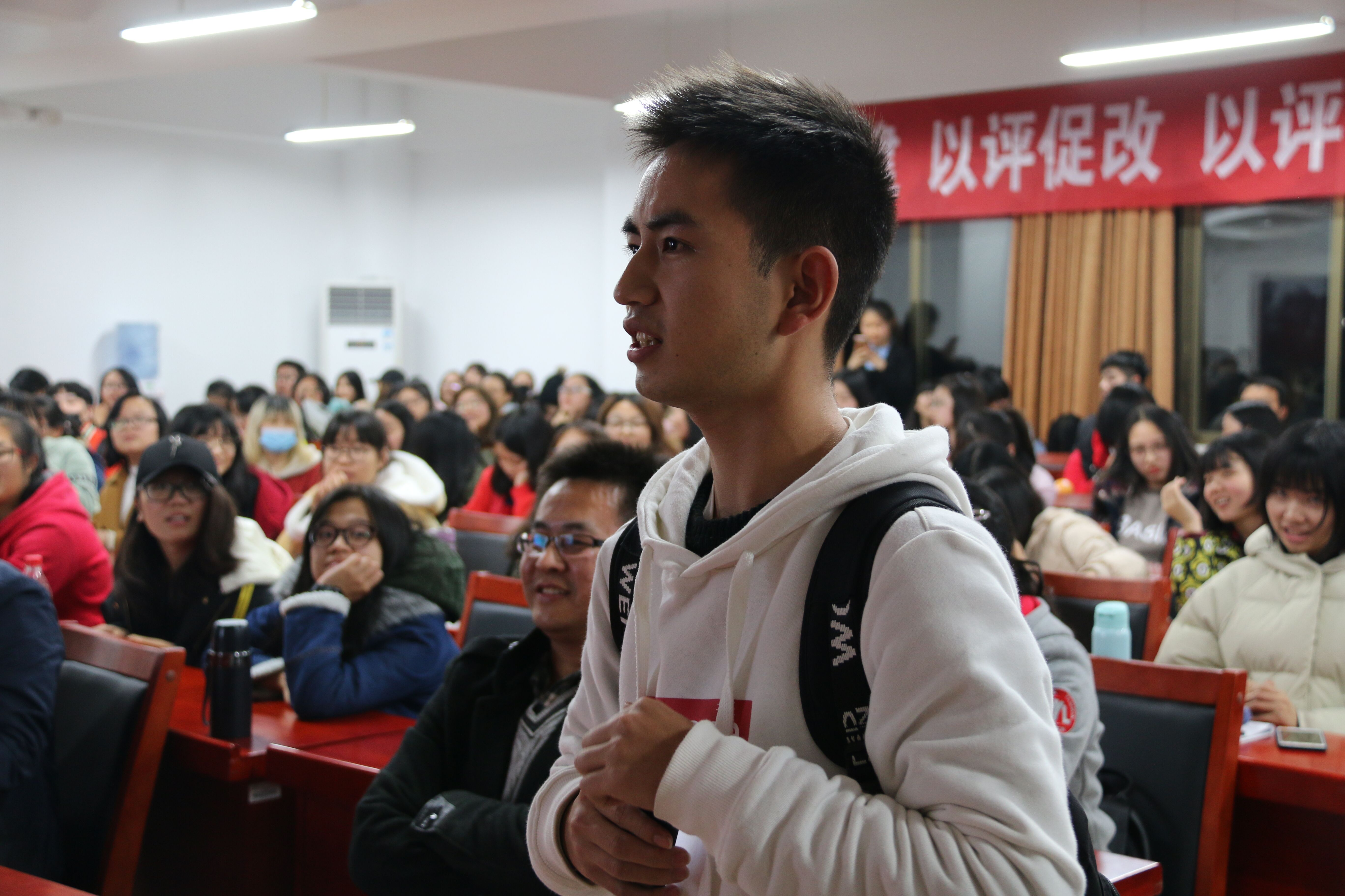 王教授指出,曾经的传播是“传播给大众”,现在的传播是“大众在传播”。谈及“谁在把关”这一问题,他认为,原有的把关是专业标准、市场标准及媒介组织的立场和方针;现在的把关是传播者、生产者和消费者三者合一,没有明确的标准。再者,出现了把关角色弱化、把关意识淡化、把关权边缘化等现象。而如何判断主流?这就需要重新定义“主流媒体”,构建“主流文化”,树立“主流意识”,确立“主流价值”。通过讲述指挥家小泽征尔指出乐谱错误从而大赛夺魁的故事,他强调了身处不断变化发展的社会之中应保持独立思考判断与辩证思维的重要性。王教授采用理论与举例相结合的方式,深入浅出地剖析问题,引起了同学们强烈的共鸣。