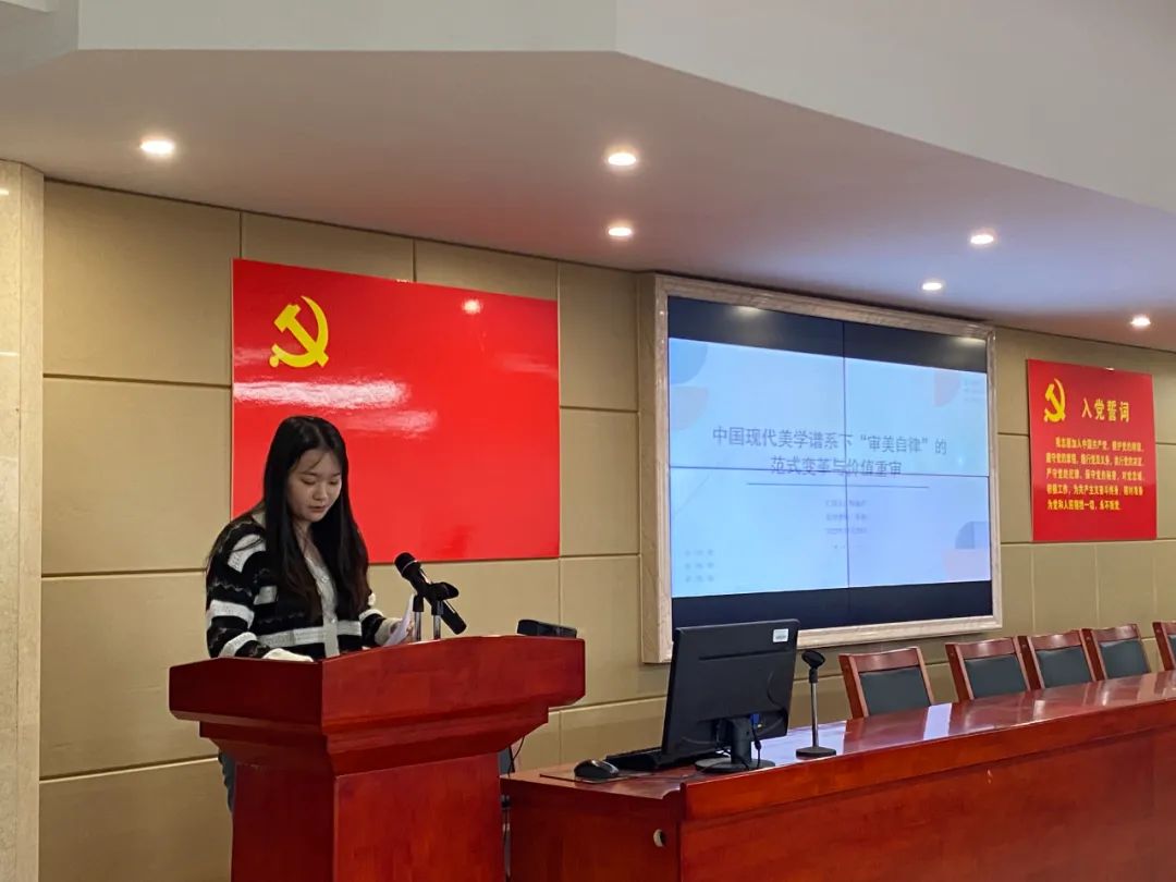 陶瑜芹同学汇报的题目为《中国现代美学谱系下‘审美自律’的范式变革与价值重申》,从美的启蒙、美的对话、美的反思三个方面阐述了审美自律与审美意识形态的双重延伸。